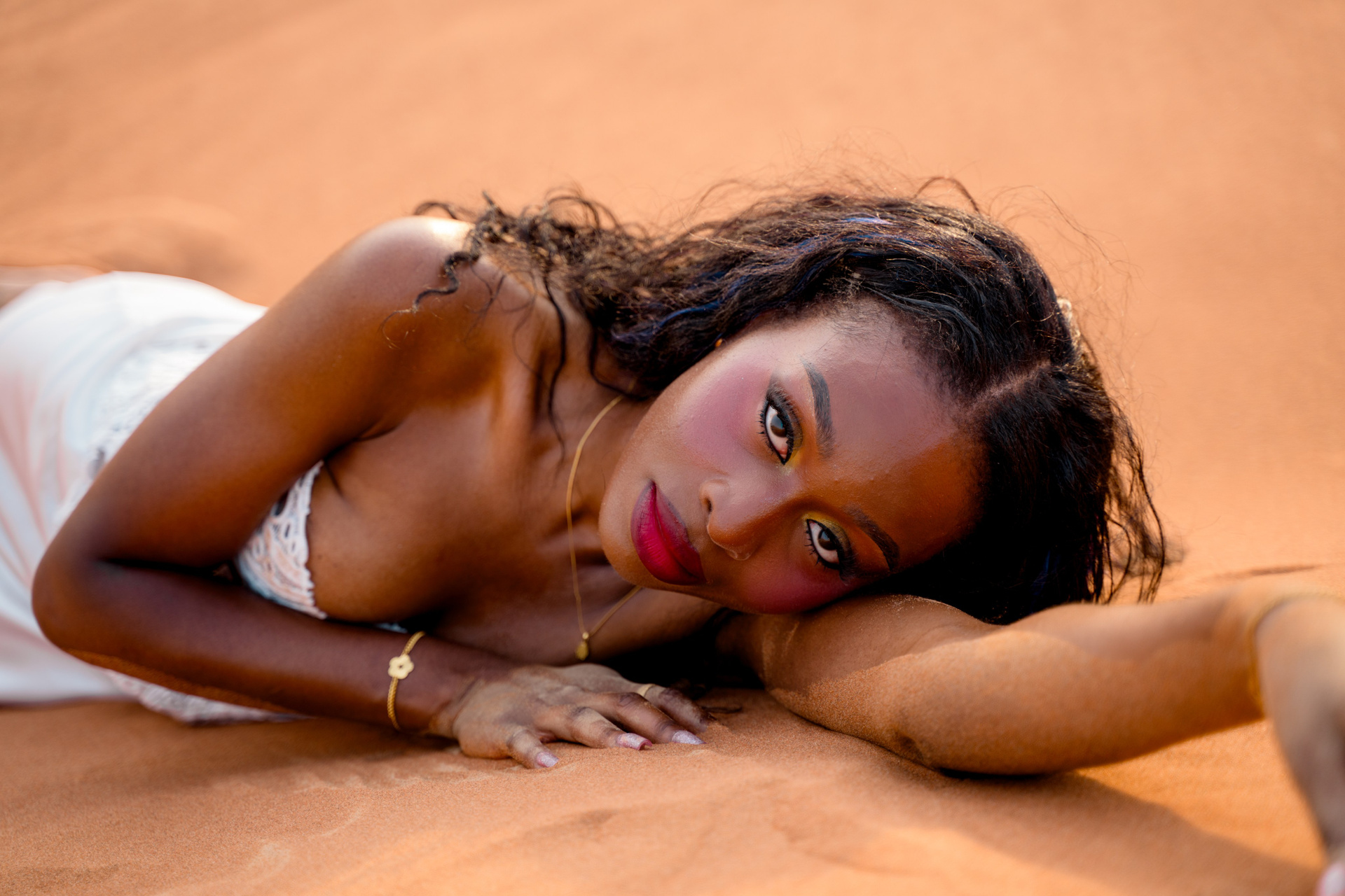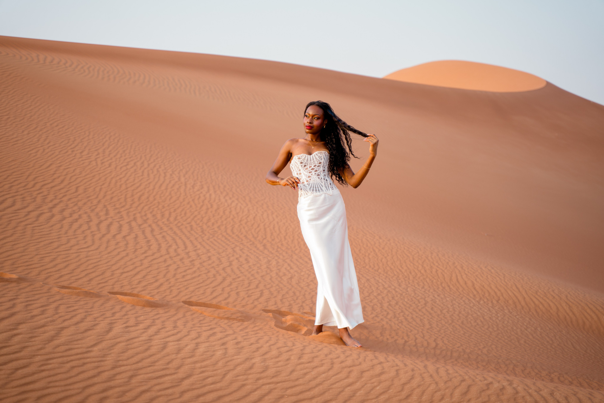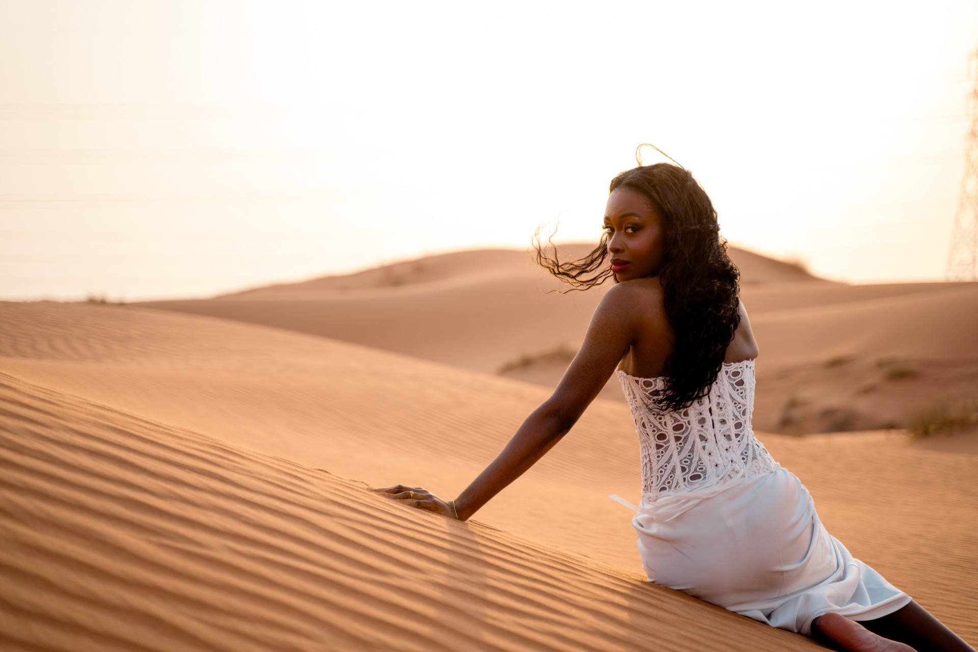 В пустыне отлично смотрятся натуральные, светлые оттенки — белый, бежевый, карамель.